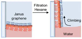 Orthogonal functionalization of 2D materials by selective assembly at interfaces provides opportunities to create new materials with transformative properties. Challenges remain in realizing controllable, scalable surface-selective, and orthogonal functionalization. Herein, dynamic covalent assembly is reported that directs the functionalization of graphene surfaces at liquid–liquid interfaces. This process allows facile addition and segregation of chemical functionalities to impart Janus characteristics to graphenes. Specifically, dynamic covalent functionalization is accomplished via Meisenheimer complexes produced by reactions of primary amines with pendant dinitroaromatics attached to graphenes. Janus graphenes are demonstrated to be powerful surfactants that organize at water/organic, water/fluorocarbon, and organic/fluorocarbon liquid interfaces. This approach provides general access to the creation of diverse surfactant materials and promising building blocks for 2D materials.