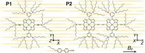 Linear porphyrin oligomers have found various applications as synthetic molecular wires in the context of light harvesting, solar energy conversion and molecular electronics. In many of these applications a partial ordering of the molecules helps to improve the reaction efficiency or device performance. In this work we study the orientational properties of the building blocks of such porphyrin-based molecular wires, namely a porphyrin monomer and the corresponding butadiyne-bridged dimer. The porphyrins have been embedded in the nematic liquid crystal solvent 4-cyano-4’-pentylbiphenyl (5CB) and the anisotropic properties of their photogenerated triplet states were characterised by transient electron paramagnetic resonance (EPR) spectroscopy. When aligned in strong magnetic fields, the liquid crystal molecules impose their orientational anisotropy onto the solute guest molecules whose orientation-dependent magnetic properties can then be explored. The line shape analysis of the porphyrin triplet state EPR spectra – highly sensitive to small conformational changes – confirms the orientation of the zero-field-splitting (ZFS) tensors previously determined for these molecules by magnetophotoselection experiments. A biaxial distribution function is shown to be necessary to simulate the experimental EPR data. The biaxial behaviour, in conjunction with symmetry considerations, allows an unambiguous assignment of the three ZFS tensor axes to the molecular axes. From the determined orientational distributions of the porphyrins in 5CB, the biaxial order parameters for both molecules were calculated.